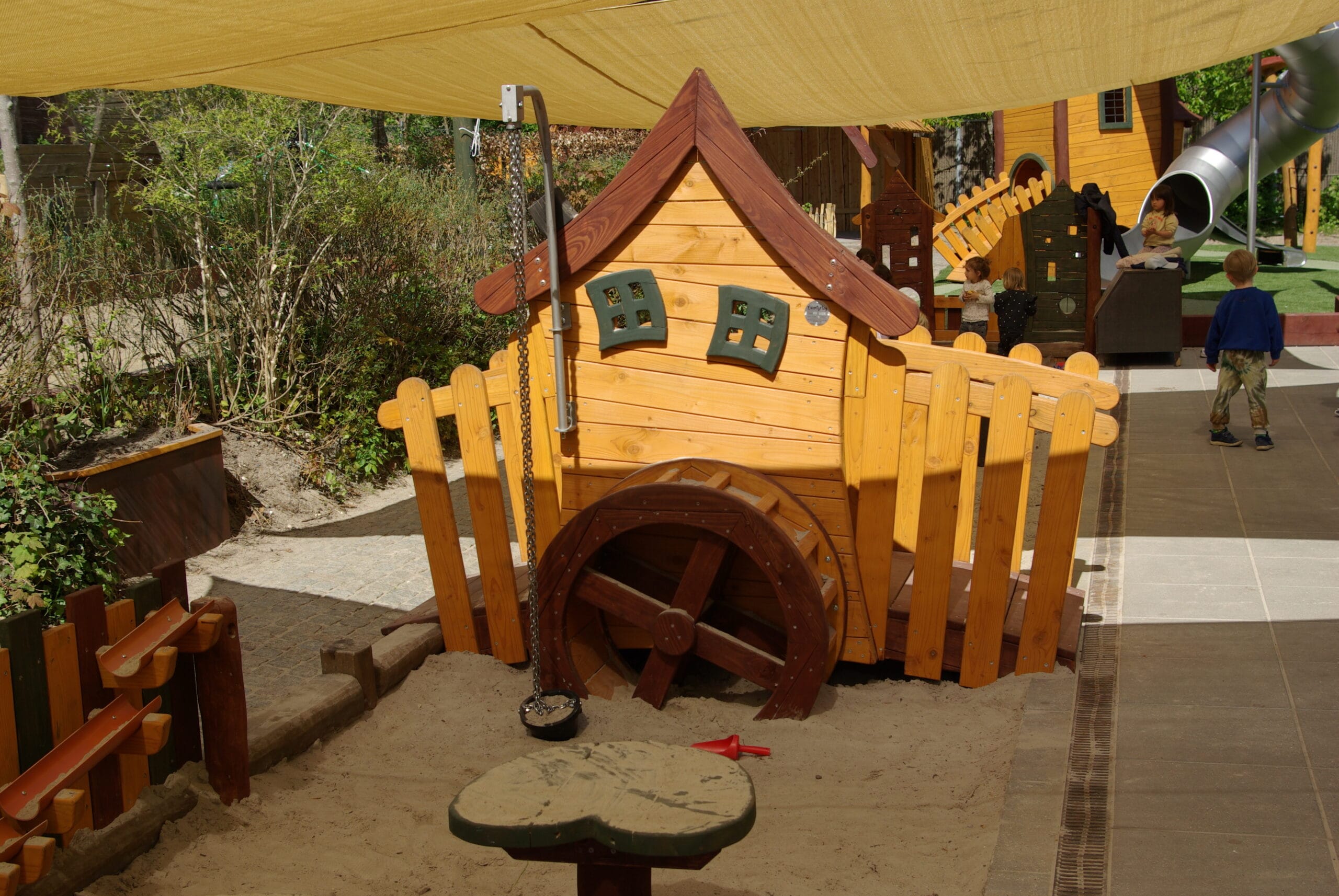 På møllehuset monteres en sandkran, der kan betjenes både fra broen og i en radius foran. Det åbner op for samarbejdsleg, hvor flere børn kan være med til at styre kranen og finde på deres egne lege og opgaver.