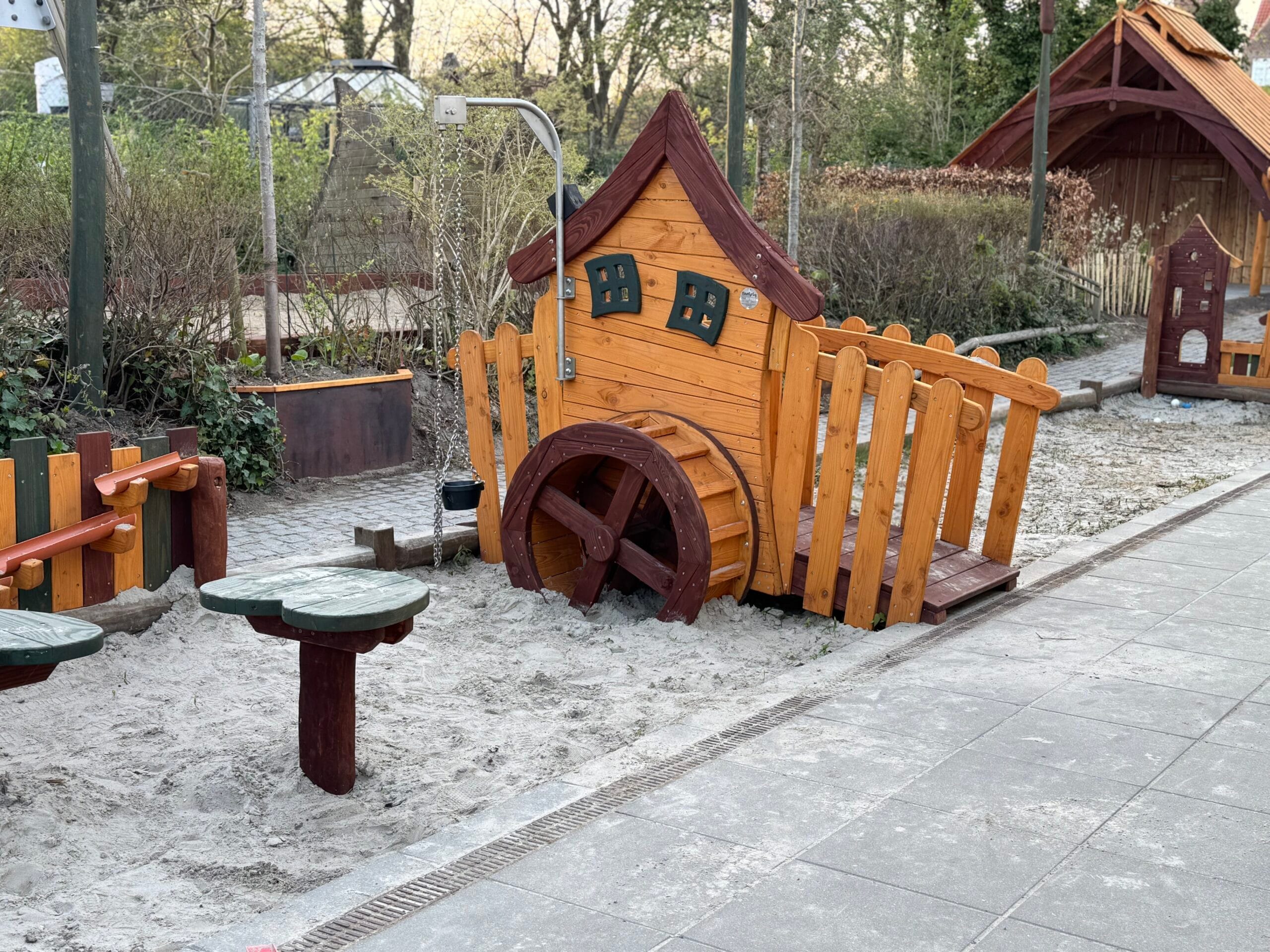 LegehuseEn flot og fantasifuld mølle med masser af funktioner. Møllen står på en lille buet bro, som skaber fornemmelsen af, at den er placeret ude i vandet. Broen er solid og nem at gå på, både for børn og voksne.